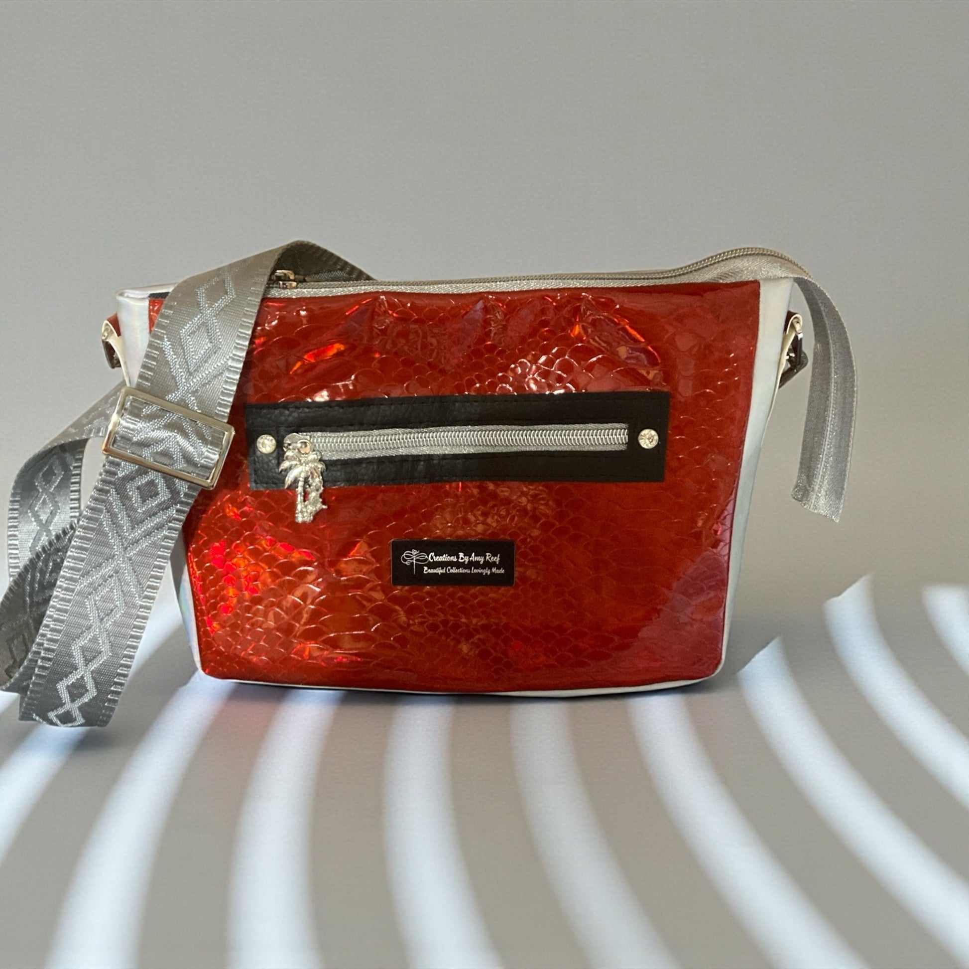 The Arsia Cross Body Bag is your ticket to turning heads at any gathering. Crafted from eye-catching iridescent viper red snake-skin vinyl with shimmering silver metallic accents, this statement piece practically glows under party lights. Packed with functionality, it features multiple storage solutions: an exterior zipper pocket, snap pocket, interior zip pocket, credit card slot, and coin compartment—plus a top expandable zipper closure. The water-resistant black and white scroll canvas lining adds sophistication, while premium silver hardware elevates every detail. Whether you're hitting the dance floor or making a grand entrance, this bag ensures you arrive in style.