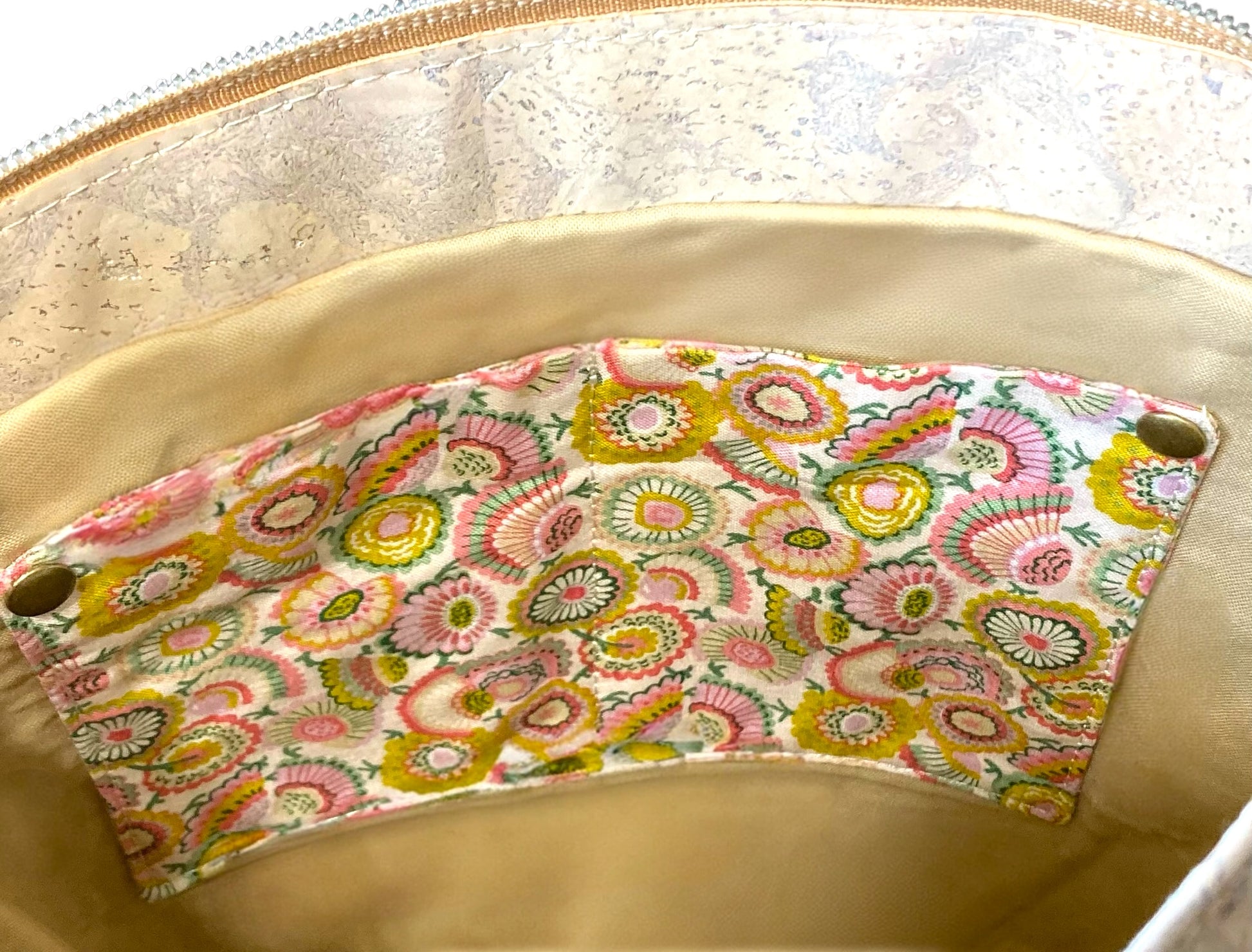 Crafted from textured vanilla cork, this Cross Body Tote combines understated elegance with practical design. It features an outside zipper enhanced by a stylish overlay and a teardrop zipper pull, complemented by antique bronze hardware that adds a refined touch. The adjustable cappuccino webbing strap ensures a perfect fit, while the recessed zipper and beautiful cotton lining featuring interior slip pockets provide organized convenience in a sleek, sophisticated silhouette.
